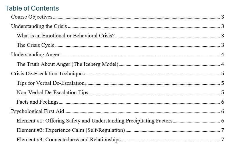 This comprehensive course provides your team with the foundational knowledge and practical techniques to prevent, de-escalate, and respond effectively to emotional and behavioral crises. Our focus is on fostering safety, preserving relationships, and teaching staff how to leverage Psychological First Aid to help individuals regain control and emotional balance.
