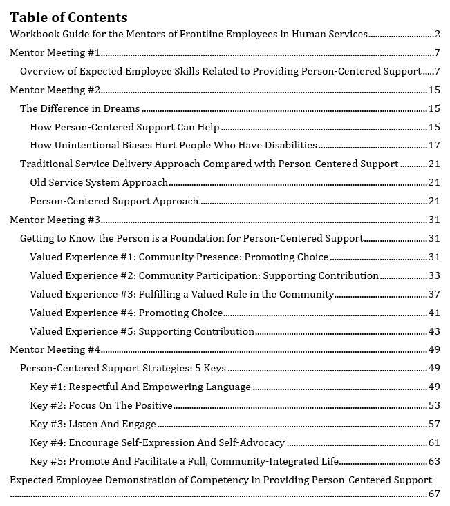 This workbook guides a coaching and mentoring program designed to develop essential skills for direct support professionals in human services. The program, which can be delivered in either a small group or one-on-one format, uses mentor meetings to focus on person-centered support. Employees will learn to practice active listening, respectful communication, and individual empowerment. The workbook includes interactive discussions, scenarios, and activities to help employees understand and apply these principles in their daily work. It covers key concepts such as community integration, self-advocacy, and the importance of honoring individual preferences, ultimately promoting a higher quality of support for the individuals they serve. This set includes one coach’s workbook and ten employee workbooks.
