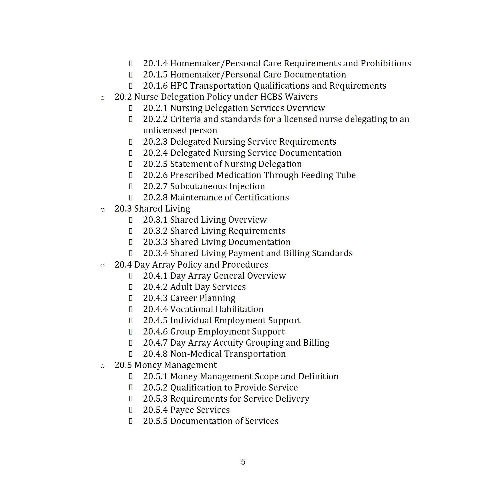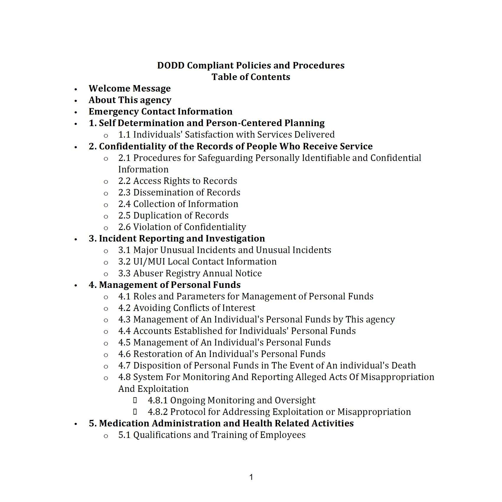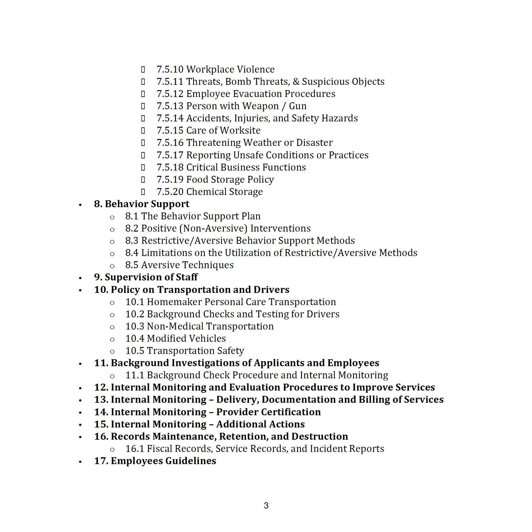 - Operational Procedures: This section covers staff supervision, transportation, background investigations, and internal monitoring to maintain a well-run organization.