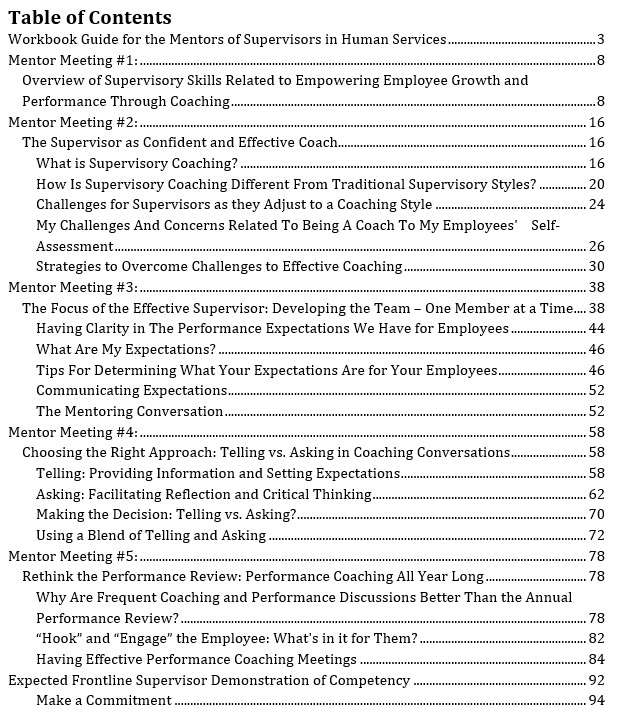 This Coaching Workbook for Supervisors in Human Services is a mentor-led training tool that equips experienced supervisory coaches to teach frontline supervisors how to coach employees effectively. This workbook is designed to be used in a structured mentoring relationship, where a senior supervisor helps guide newer or less experienced supervisors in building the confidence and skills needed to coach their staff.
